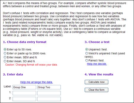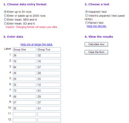 Now choose following the steps on the page. (We almost always use the unpaired t-test*) Enter your data. Click “Calculate Now” when data is entered. Read your results!
