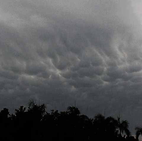 These typical top-lit, well developed mammatus clouds, were photographed at 3.00 pm at ISB. The formation persisted for 30 minutes before the onset of a tropical thunder storm in October 2000. Photo: Jacobs |