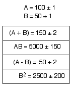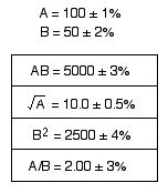 | Remember - the percentage error rule should only be used with small errors of a few percent and it only applies to products, powers etc. For large errors and for math functions, sines, cosines, logs etc. it is more reliable and more efficient to make an extreme value calculation to find a final uncertainty. |