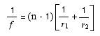 The lensmaker's formula gives the focal length as.... ... where n is the refractive index. The radius of curvature is positive for a converging surface and negative for a diverging surface. At once, f = r for a symmetrical convex glass lens (n = 1.5). |