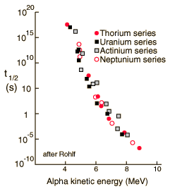 Alpha particle kinetic energy varies by a factor of two and is related (as shown) to the half-lives of the heavy parent nuclei. The small variation in particle energy, over the extraordinary half-life range, is accounted for by the tunneling of alpha particles out of the nucleus, even though they have very much less energy than the barrier potential (~28 MeV). |