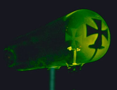 on the glass wall. The green glow is fluorescence as high energy