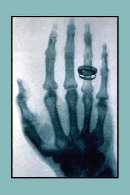 Wilhelm Roentgen was 50; head of Physics at the University of Wurzburg; author of many books. Late one Friday evening he wrapped a Crooke's tube in black card to mask the light from the fluorescence of the glass walls. He turned the tube off, then on again. The cardboard trapped all the visible light. By chance, a screen coated with barium platinocyanide (a fluorescent material used at the time to develop photographic plates) lay on a chair a few feet away. He noticed a soft glow (He could not see it was green because he was colorblind). A faint letter A appeared on the screen. A student had used a finger to write A on the liquid barium platinocyanide. Roentgen turned off the tube. The 'A' disappeared. He turned it on again. The A reappeared. Rays were passing through the black card.