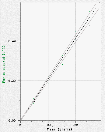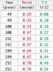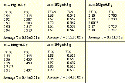 The mass was found with an electronic balance to within ± 0.5 g. The period was measured five times for each of five masses. The error in the period listed in Table 1 below is half the range.Table 1