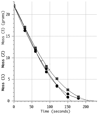 - mass-time curves for three ice cubes in water at 18°C. No error bars are shown.