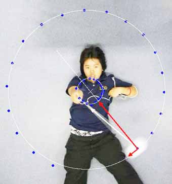 | Fig 4 - hand and ball positions plotted in Logger Pro. The centrietal force is shown in red. The tension force (white vector) and the tangential component are also shown. The lead angle is the angle between the tension force and radius vector. |