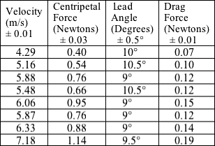 Errors were carried through the calculations in Logger Pro by finding possible extreme values using the errors listed in table 1. Sample Calculation = [(0.0117)*(4.29 ± 0.01)2]/(0.53 ± 0.03) = 0.41 ± 0.03 Newtons = Tangent(10.0 ± 0.5)*(0.41 ± 0.03) = 0.072 ± 0.01 Newtons |