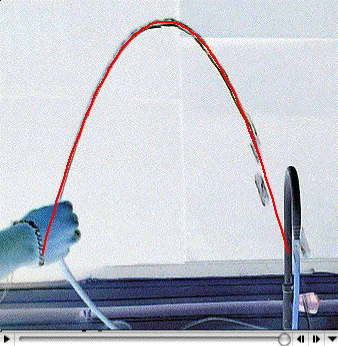 Fig 1 the stream of water follows a symetrical parabolic path about a vertical axis, (fitted curve), because air resistance can be neglected, and the acceleration (g) is constant and vertical. |