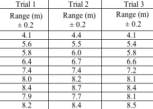 The measured ranges are listed for each trajectory, for each of the nine elevation settings. The measured ranges are more consistent than the calcuated ranges using the estimates of initial velocities shown in table 3, but the accuracy is disappointing and indicates that the launcher is not as consistent as expected. Errors The measured ranges are consistent to within ±0.2 m for each elevation setting, where the error is half the range. |