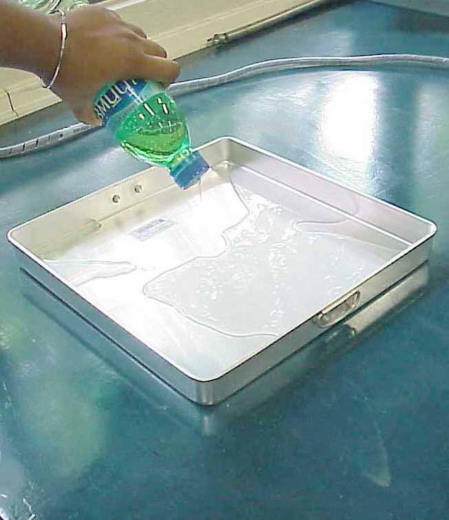 Detergent lowers the surface tension so that the water will wet the bottom of the tank.