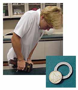 3 Ryne Larsen informs us that the Thai ten baht coin can be taken apart without damaging the central disc by repeatedly clamping the coin edge-on in a vice to stretch the outer alloy ring. He also reports that the similar Canadian coin can be dismantled by freezing and hammering out the central disc.