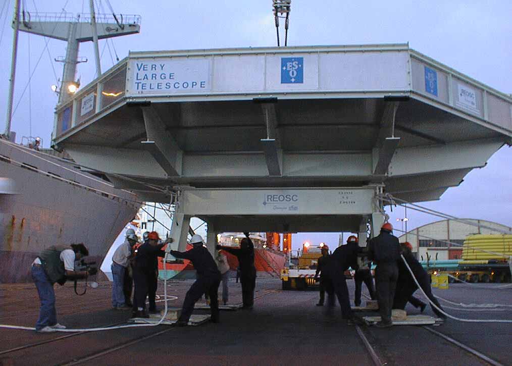 The 8.2-m mirror in its special Tranport Container was unloaded in the port of Antofagasta, Chile, on December 6, 1997. The Zerodur blanks for the four 8.2-metre VLT mirrors were produced by the Schott Glaswerke (Mainz, Germany) and polished at the REOSC factory (St. Pierre du Perray, France). |