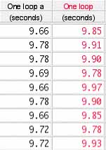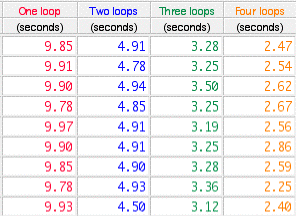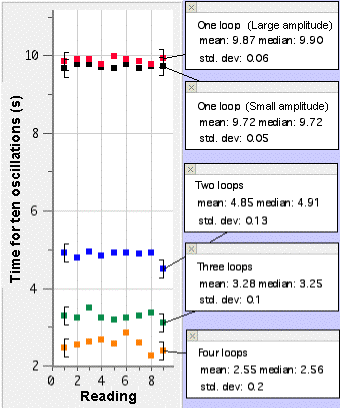 A 1.5 meter steel spring was suspended above the floor by stretching it to a length of 8.8 meters between two people. Standing waves of one, two, three, and four loops, were established on the spring by driving small transverse oscillations by hand. The time for ten oscillations was measured independently with stop watches by nine people. The measurements are recorded in Table 1.