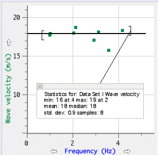 Graph 2 Two points are shown for each standing wave. The difference in the point positions represents the errors in the data. A line has been fitted to the points by hand, showing that within ±1 m/s the wave velocity is a constant 18 m/s. The computer calculation of mean and standard deviation confirms this value, within errors.