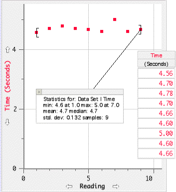 The spring was stretched to 8.8 meters. A sharp pulse was made by a single sideways movement (across and return) at one end. The time for the pulse to reflect back and forth ten times was measured with stop watches. The time data, the mean, and the standard deviation are shown in Graph 3.