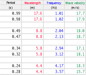 Graph 1 The panels show that the median and mode for each data set are almost identical, (as expected for normally distributed random errors). The mean values and the standard deviations for waves of 30 cm amplitude are listed in Table 3. The increased errors at higher frequencies are due to the difficulty of timing the oscillations with hand held stop watches.