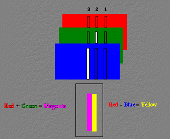 | The prism disperses the three primary colors of the white background different amounts. The three lines can be represented by the panels in the diagram. Line one is the combination of Red Green and Blue, resulting in white. Line 2 is a combination of Red and Blue, resulting in Yellow. Line 3 is a combination of Red and Green resulting in Magenta. |